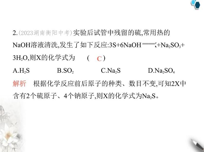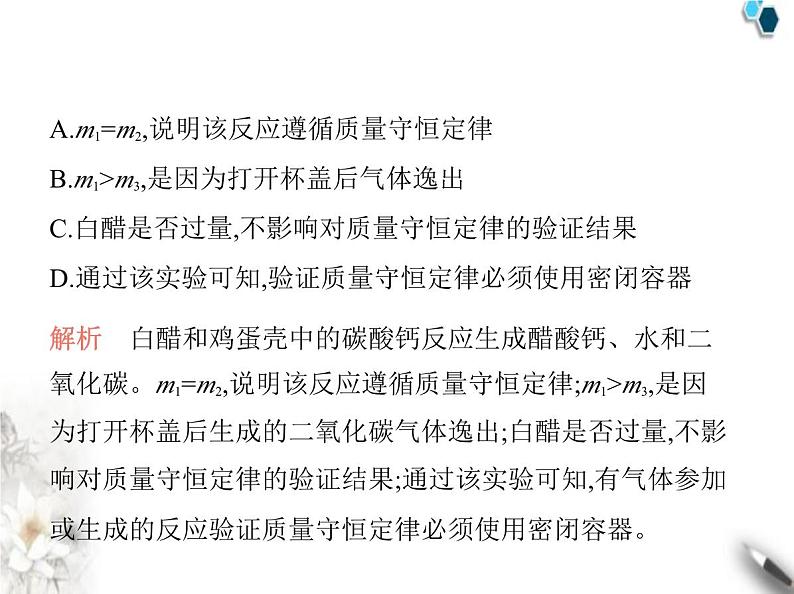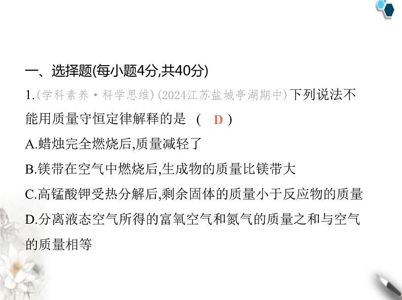 满分:100分 限时: 45分钟1.(学科素养·科学思维)(2024江苏盐城亭湖期中)下列说法不能用质量守恒定律解释的是 ( )A.蜡烛完全燃烧后,质量减轻了B.镁带在空气中燃烧后,生成物的质量比镁带大C.高锰酸钾受热分解后,剩余固体的质量小于反应物的质量D.分离液态空气所得的富氧空气和氮气的质量之和与空气的质量相等一、选择题(每小题4分,共40分)D解析 分离液态空气得到富氧空气和氮气,属于物理变化,不能用质量守恒定律解释。2.(2023湖南衡阳中考)实验后试管中残留的硫,常用热的NaOH溶液清洗,发生了如下反应:3S+6NaOH 2X+Na2SO3+3H2O,则X的化学式为 ( )A.H2S B.SO2 C.Na2S D.Na2SO4 C解析 根据化学反应前后原子的种类、数目不变,可知2X中含有2个硫原子、4个钠原子,则X的化学式为Na2S。3.(2024四川简阳期末)铜在潮湿的空气中易发生化合反应生成碱式碳酸铜,俗称铜绿,化学式为Cu2(OH)2CO3。下列说法正确的是 ( )A.氮气一定参与了反应B.铜绿中铜元素的化合价为+1价C.二氧化碳一定参与了该反应D.水一定没有参与该反应C解析 化学反应前后元素的种类不变,则氮气一定没有参加反应,二氧化碳与水一定参与了该反应。根据化合物中,正负化合价代数和为0,可判断出碱式碳酸铜中铜元素的化合价为+2价。4.(创新装置)(2024山东青岛城阳期末)已知白醋能与鸡蛋壳反应生成二氧化碳气体,同学们利用内有过滤网的带盖塑料杯,设计如图所示实验验证质量守恒定律。实验前药品和装置的总质量为m1,倒立杯子充分反应后称量总质量为m2,打开杯盖后称量总质量为m3,三者的关系为m1=m2>m3,下列说法不正确的是 ( )DA.m1=m2,说明该反应遵循质量守恒定律B.m1>m3,是因为打开杯盖后气体逸出C.白醋是否过量,不影响对质量守恒定律的验证结果D.通过该实验可知,验证质量守恒定律必须使用密闭容器解析 白醋和鸡蛋壳中的碳酸钙反应生成醋酸钙、水和二氧化碳。m1=m2,说明该反应遵循质量守恒定律;m1>m3,是因为打开杯盖后生成的二氧化碳气体逸出;白醋是否过量,不影响对质量守恒定律的验证结果;通过该实验可知,有气体参加或生成的反应验证质量守恒定律必须使用密闭容器。5.(情境素材·时事热点)(2023内蒙古包头中考)卡塔尔世界杯指定用球的芯片传感器产自中国。制取芯片的主要材料是硅,其生产过程涉及的主要化学反应为2C+SiO2 Si+2CO↑。关于该反应叙述正确的是 ( )A.2C表示2个碳元素B.化学反应前后原子数目不变C.反应前后硅元素的化合价不变D.参加反应的C和SiO2的质量比为2∶1B解析 元素只讲种类、不论个数,2C表示2个碳原子;化学反应前后原子的数目不变;硅元素的化合价由+4变为0;参加反应的C和SiO2的质量比为(12×2)∶60≠2∶1。6.(2021天津中考)将16 g 纯净物R在足量氧气中完全燃烧,生成44 g 二氧化碳和36 g 水。下列判断正确的是 ( )A.R只含碳、氢元素B.消耗氧气32 g C.R含碳、氢、氧三种元素D.R中碳元素的质量分数为70%A解析 44 g 二氧化碳中碳元素的质量为44 g× =12 g,36 g 水中氢元素的质量为36 g× =4 g,碳、氢元素的质量和等于纯净物R的质量,则R中一定不含氧元素;由质量守恒定律可知,消耗氧气的质量为44 g+36 g-16 g=64 g;R中碳元素的质量分数为 ×100%=75%。7.(2023安徽中考)口罩的熔喷布具有过滤病毒的作用,Z是合成熔喷布的主要原料,由X制备Z的微观示意图如下。下列说法正确的是( ) A.X的化学式为C8H3B.反应前后分子种类不变C.Y、Z在O2中充分燃烧产物相同D.反应前后原子个数不变D解析 由微观示意图可知,X的化学式为C3H8;化学反应前后分子种类发生变化;Y、Z的组成元素不同,在O2中充分燃烧产物不同。8.(2024河北廊坊十六中期末)在反应2A+3B 2C+3D中,C、D的相对分子质量之比为7∶18。若2.6 g A与B完全反应后,生成5.4 g D。则此反应中,B与D的质量比为 ( )A.7∶9 B.49∶54C.13∶27 D.13∶54A解析 设生成C的质量为x,C的相对分子质量为7n,则D的相对分子质量为18n。2A+3B 2C + 3D 14n 54n x 5.4 g = ,解得x=1.4 g,根据质量守恒定律可知参加反应的B的质量为5.4 g+1.4 g-2.6 g=4.2 g,则此反应中B与D的质量比为4.2 g∶5.4 g=7∶9。9.(模型法)(2023湖南湘潭中考)甲、乙、丙、丁四种物质在密闭容器内反应前后的质量关系如图所示,下列说法错误的是 ( ) BA.X=19B.该反应为分解反应C.丙可能是该反应的催化剂D.甲、乙的相对分子质量之比可能为1∶16解析 根据质量守恒定律,X=10+10+10+10-9-2-10=19;该反应是甲和乙反应生成丁,属于化合反应;反应前后丙的质量不变,丙可能是该反应的催化剂,也可能没参加反应;参加反应的甲、乙的质量比为1 g∶8 g=1∶8,如果化学方程式中,甲、乙的化学计量数之比为2∶1,则甲、乙的相对分子质量之比为1∶16。10.(课标新增·处理实验数据)(2023江苏无锡中考)柠檬酸(C6H8O7)能与碳酸氢钠反应生成二氧化碳。向4份等质量、等浓度的柠檬酸溶液中分别加入一定质量的碳酸氢钠,充分反应,4次实验数据记录见下表。则实验④中参加反应的碳酸氢钠的质量为 ( )A.0.84 g B.1.26 g C.1.68 g D.2.10 gB解析 ①中柠檬酸的质量为0.96 g,加入碳酸氢钠的质量为0.42 g,产生二氧化碳的体积为112 mL;②中柠檬酸的质量为0.96 g,加入碳酸氢钠的质量为m1 g,产生二氧化碳的体积是224 mL(①中的2倍),此时m1=0.42×2=0.84;③中柠檬酸的质量为0.96 g,加入碳酸氢钠的质量为m2 g,产生二氧化碳的体积是336 mL(①中的3倍),此时m2=0.42×3=1.26;④中柠檬酸的质量为0.96 g,加入碳酸氢钠的质量为m3 g,产生二氧化碳