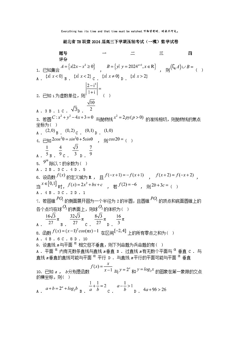 2024届湖北省T8联盟高三下学期压轴考试(一)数学试题: 这是一份2024届湖北省T8联盟高三下学期压轴考试(一)数学试题,共10页。