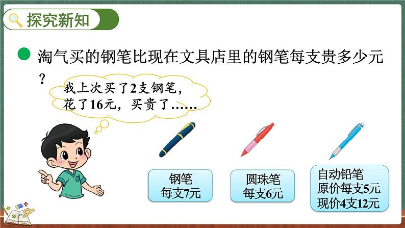 答:淘气买的钢笔比现在文具店里的钢笔每支贵1元。