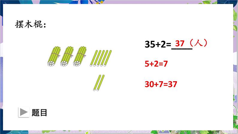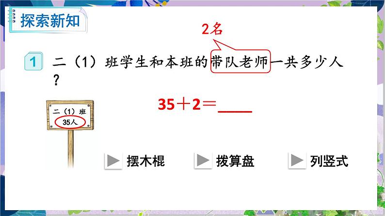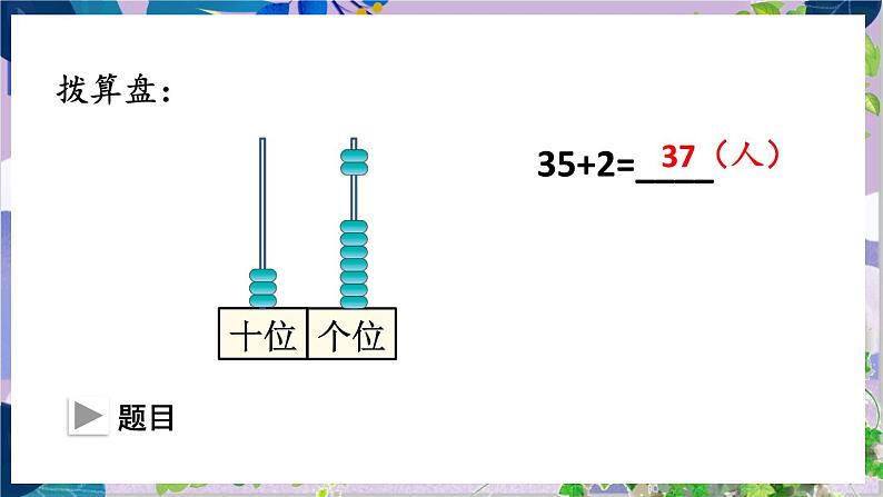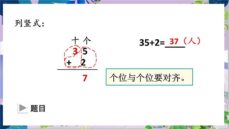 这是一份小学数学人教版二年级上册不进位加说课课件ppt,共14页。PPT课件主要包含了参观博物馆,+2=,你能口算吗,先算5+2=7,再算30+7=37,个位与个位对齐,从个位加起,37人,想怎样对位,列竖式计算等内容,欢迎下载使用。