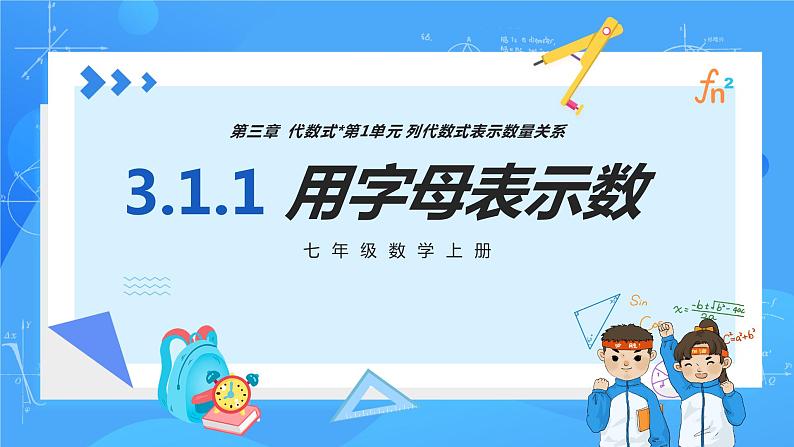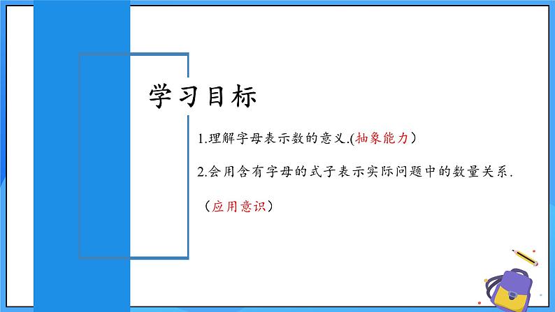 1.理解字母表示数的意义.(抽象能力)2.会用含有字母的式子表示实际问题中的数量关系.(应用意识)
