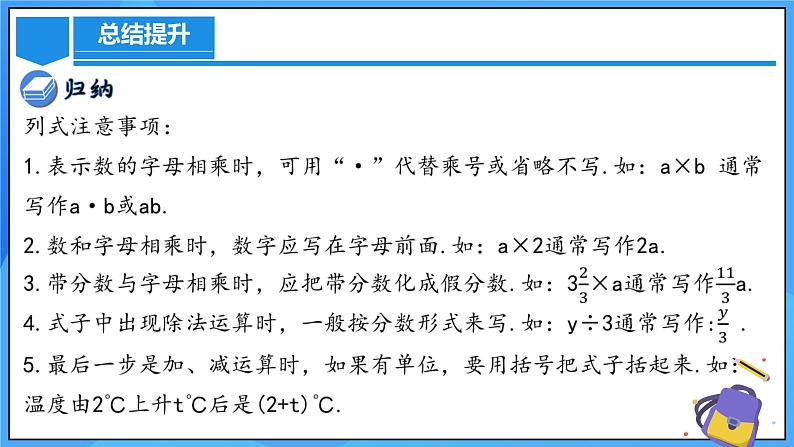 列式时应注意:①数与字母、字母与字母相乘省略乘号;②数与字母相乘时数字在前;③式子中出现除法运算时,一般按分数形式来写;④带分数与字母相乘时,把带分数化成假分数;⑤带单位时,适当加括号.