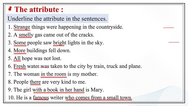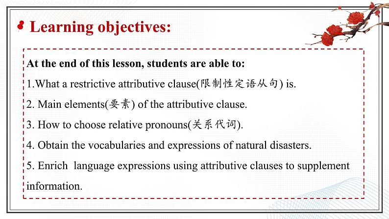 At the end f this lessn, students are able t:1.What a restrictive attributive clause(限制性定语从句) is. 2. Main elements(要素) f the attributive clause.3. Hw t chse relative prnuns(关系代词).4. Obtain the vcabularies and expressins f natural disasters.5. Enrich language expressins using attributive clauses t supplement infrmatin.
