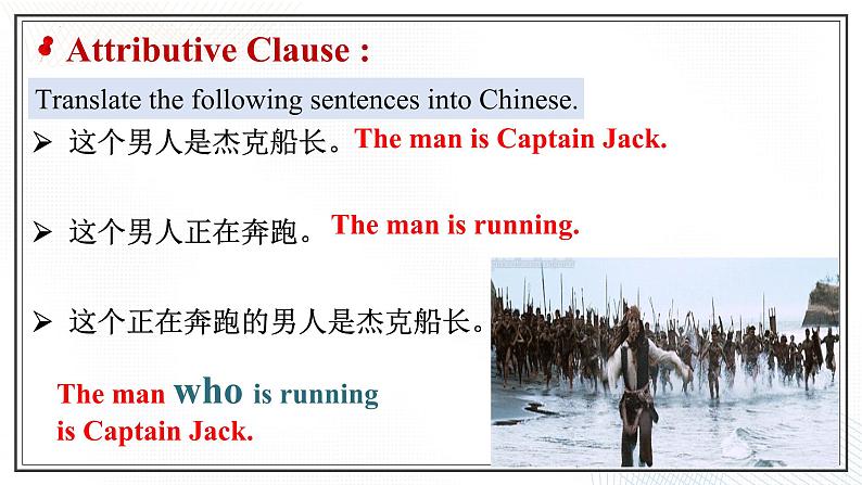 这个男人是杰克船长。 这个男人正在奔跑。 这个正在奔跑的男人是杰克船长。