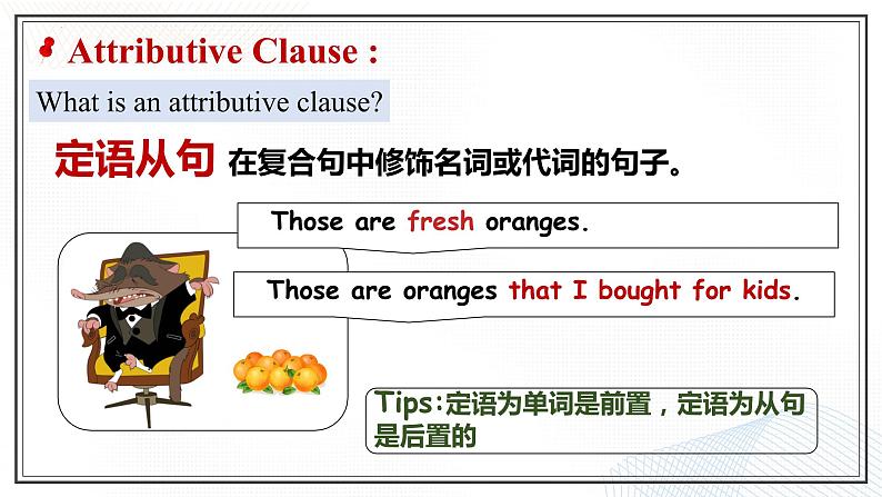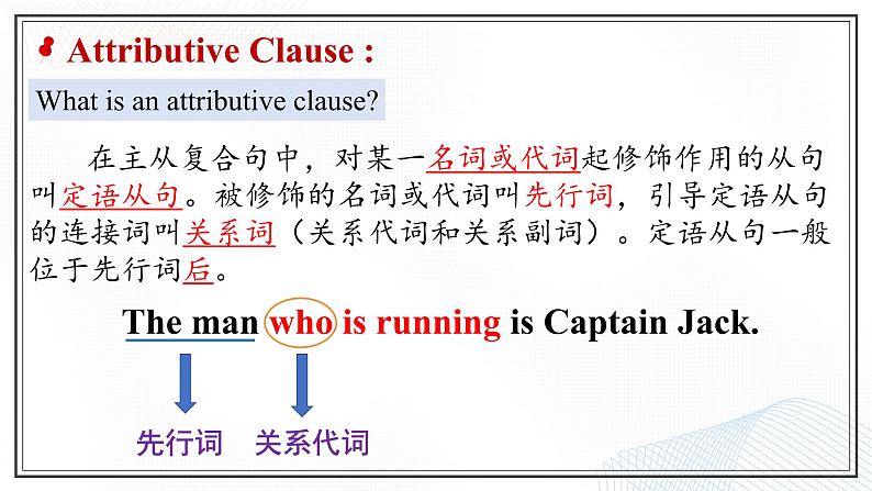 在主从复合句中,对某一名词或代词起修饰作用的从句叫定语从句。被修饰的名词或代词叫先行词,引导定语从句的连接词叫关系词(关系代词和关系副词)。定语从句一般位于先行词后。