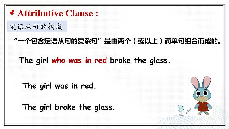 “一个包含定语从句的复杂句”是由两个(或以上)简单句组合而成的。