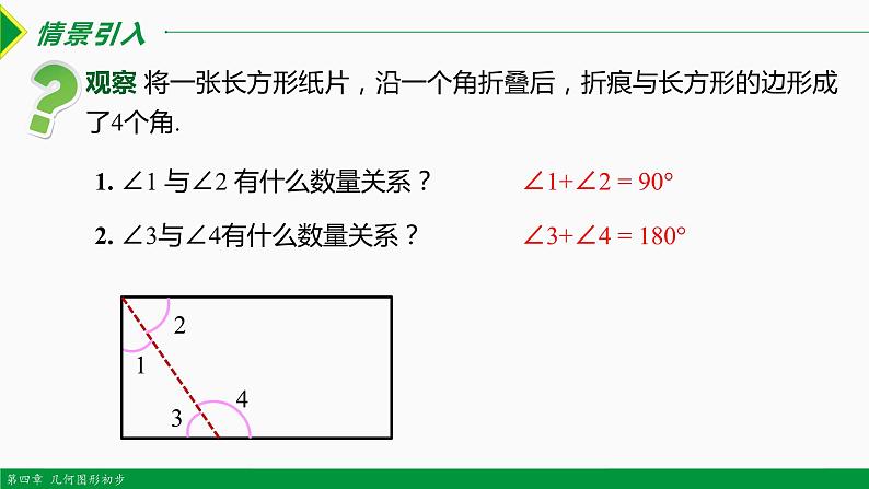 展开观察 将一张长方形纸片,沿一个角折叠后,折痕与长方形的边形成了4个角.