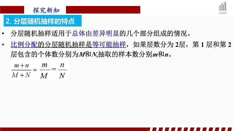 比例分配的分层随机抽样是等可能抽样,如果层数分为 2层,第 1 层和第 2 层包含的个体数分别为M和N,抽取的样本数分别m和n。