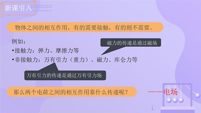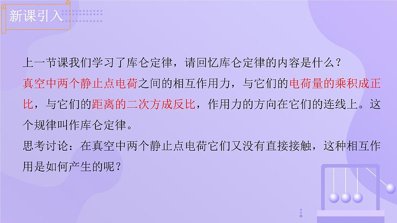 上一节课我们学习了库仑定律,请回忆库仑定律的内容是什么?真空中两个静止点电荷之间的相互作用力,与它们的电荷量的乘积成正比,与它们的距离的二次方成反比,作用力的方向在它们的连线上。这个规律叫作库仑定律。思考讨论:在真空中两个静止点电荷它们又没有直接接触,这种相互作用是如何产生的呢?