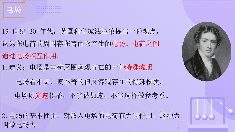 19 世纪 30 年代,英国科学家法拉第提出一种观点,认为在电荷的周围存在着由它产生的电场。电荷之间通过电场相互作用。