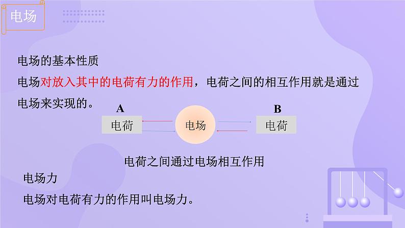 电场的基本性质电场对放入其中的电荷有力的作用,电荷之间的相互作用就是通过电场来实现的。