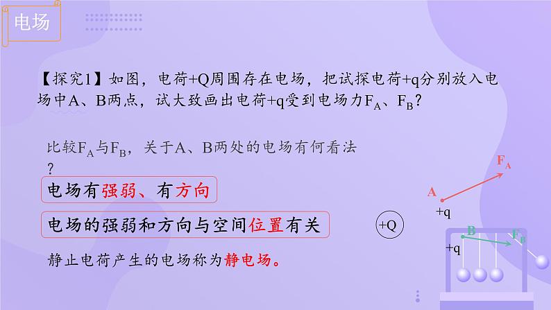 【探究1】如图,电荷+Q周围存在电场,把试探电荷+q分别放入电场中A、B两点,试大致画出电荷+q受到电场力FA、FB?