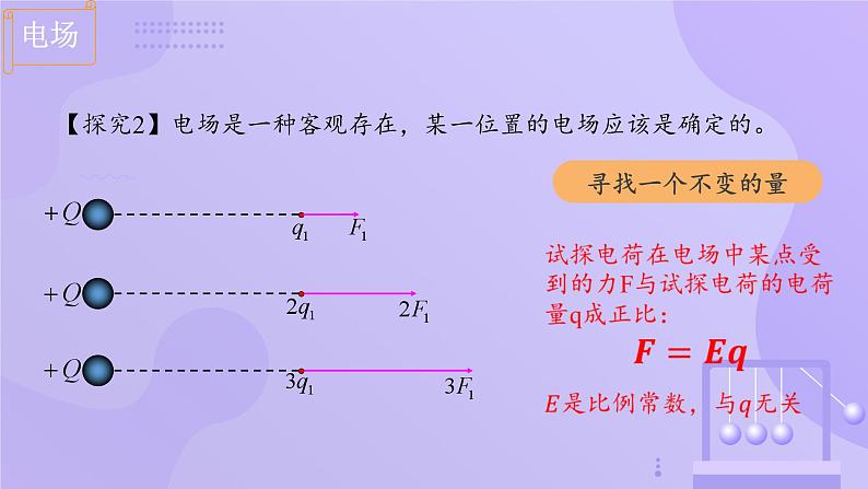 电场是在与电荷的相互作用中表现出自己的特性的,并且分析电场强度表达式可知:在研究电场的性质时,应该将电荷放入电场中,从电荷所受的静电力入手。1.试探电荷电荷量和体积都很小的点电荷,这样的电荷常常叫作试探电荷。电荷量很小,是为了使它放入后——————原来要研究的电场。体积很小,是为了便于用它来研究————————————。