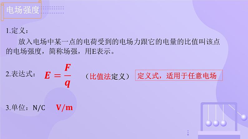 例1.关于电场强度的公式E=F/q,下列说法正确的是( )A.由公式可知,电场强度与电荷受力成正比B.由公式可知,电场强度与试探电荷所带电荷量成反比C.此公式为电场强度的定义式,可以适用于各种电场D.此公式只适用于真空中的点电荷产生的电场