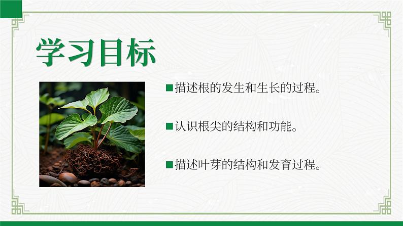 北师大版(2024)七年级上册第2节 营养器官的生长试讲课教学课件ppt: 这是一份北师大版(2024)七年级上册<a href="/sw/tb_c4049159_t3/?tag_id=26" target="_blank">第2节 营养器官的生长试讲课教学课件ppt</a>,共29页。PPT课件主要包含了营养器官,学习目标,种子都有种皮和胚,直根系,须根系,主要由不定根组成,2须根系,不定根,1直根系,根分布的特性等内容,欢迎下载使用。