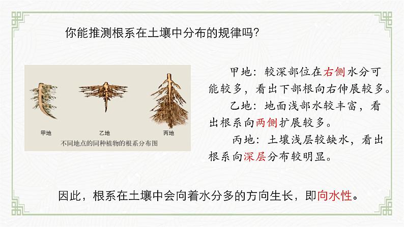 因此,根系在土壤中会向着水分多的方向生长,即向水性。