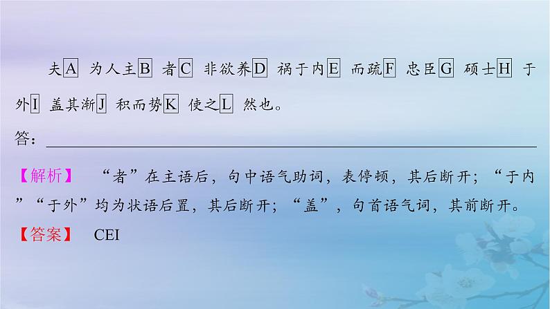 这是一份备战2025届新高考语文一轮总复习第3部分古代诗文阅读复习任务群5文言文阅读任务5掌握文言文断句的技巧与方法课件,共57页。PPT课件主要包含了答案EFG,答案C等内容,欢迎下载使用。