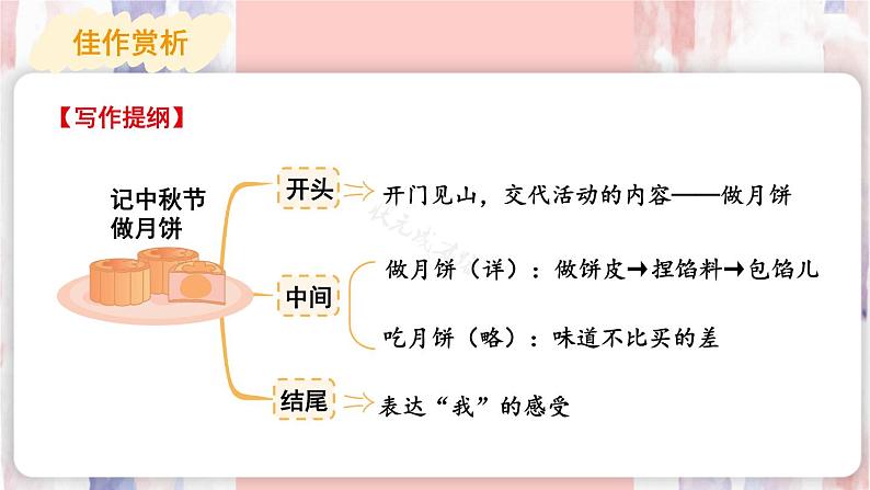 7 吃完月饼,小学生涯的最后一个中秋节就过完了,但和老师、同学们一起做月饼的快乐,还有我们吃月饼时的笑声,都在我的脑海里挥之不去……