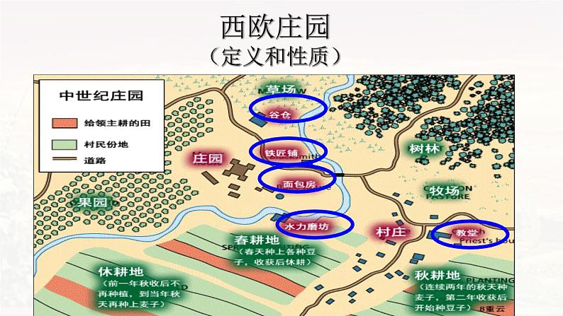 在中世纪的西欧,土地经过封建领主的层层分封,最终在各地形成了许多大小不一的庄园,庄园是中世纪西欧最基本的经济社会组织。