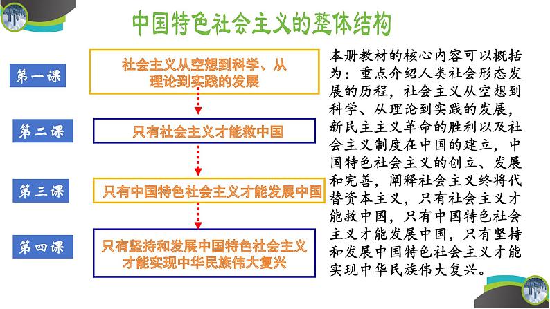 本册教材的核心内容可以概括为:重点介绍人类社会形态发展的历程,社会主义从空想到科学、从理论到实践的发展,新民主主义革命的胜利以及社会主义制度在中国的建立,中国特色社会主义的创立、发展和完善,阐释社会主义终将代替资本主义,只有社会主义才能救中国,只有中国特色社会主义才能发展中国,只有坚持和发展中国特色社会主义才能实现中华民族伟大复兴。