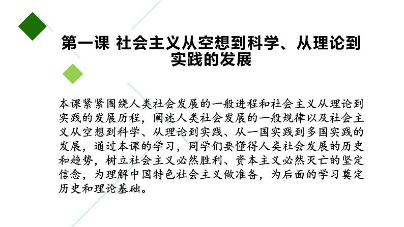 本课紧紧围绕人类社会发展的一般进程和社会主义从理论到实践的发展历程,阐述人类社会发展的一般规律以及社会主义从空想到科学、从理论到实践、从一国实践到多国实践的发展,通过本课的学习,同学们要懂得人类社会发展的历史和趋势,树立社会主义必然胜利、资本主义必然灭亡的坚定信念,为理解中国特色社会主义做准备,为后面的学习奠定历史和理论基础。