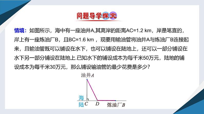 情境:如图所示,海中有一座油井A,其离岸的距离AC=1.2 km,岸是笔直的,岸上有一座炼油厂B,且BC=1.6 km ,现要用输油管将油井A与炼油厂B连接起来,且输油管既可以铺设在水下,也可以铺设在陆地上,还可以一部分铺设在水下另一部分铺设在陆地上.已知水下的铺设成本为每千米50万元,陆地的铺设成本为每千米30万元,那么铺设输油管的最少花费是多少?