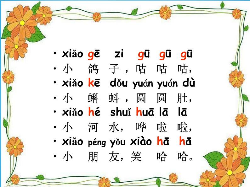 xiǎ gē zi gū gū gū小 鸽 子 ,咕 咕 咕,xiǎ kē dǒu yuán yuán dù小 蝌 蚪 ,圆 圆 肚,xiǎ hé shuǐ huā lā lā小 河 水, 哗 啦 啦,xiǎ péng yǒu xià hā hā小 朋 友,笑 哈 哈。
