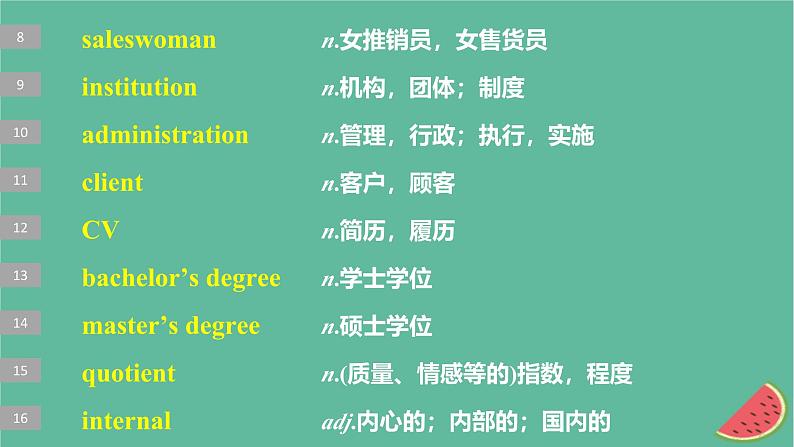 saleswman n.女推销员,女售货员institutin n.机构,团体;制度administratin n.管理,行政;执行,实施client n.客户,顾客CV n.简历,履历bachelr’s degree n.学士学位master’s degree n.硕士学位qutient n.(质量、情感等的)指数,程度internal adj.内心的;内部的;国内的