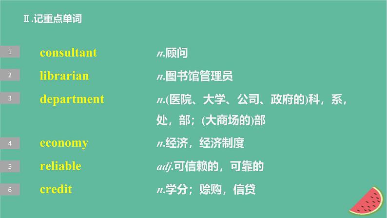 cnsultant n.顾问librarian n.图书馆管理员department n.(医院、大学、公司、政府的)科,系,处,部;(大商场的)部ecnmy n.经济,经济制度reliable adj.可信赖的,可靠的credit n.学分;赊购,信贷