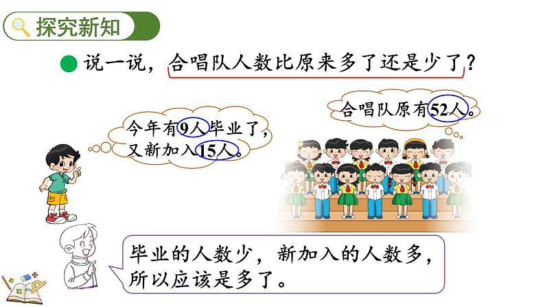 这是一份北师大版二年级上册星星合唱队示范课课件ppt,共26页。PPT课件主要包含了学习目标,竖式计算,复习导入,情景导入,探究新知,合唱队现在有多少人,-9=6人,+6=58人,-9+15=,+15等内容,欢迎下载使用。