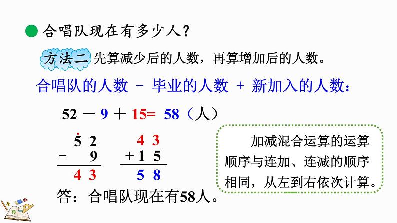 加减混合运算的运算顺序与连加、连减的顺序相同,从左到右依次计算。