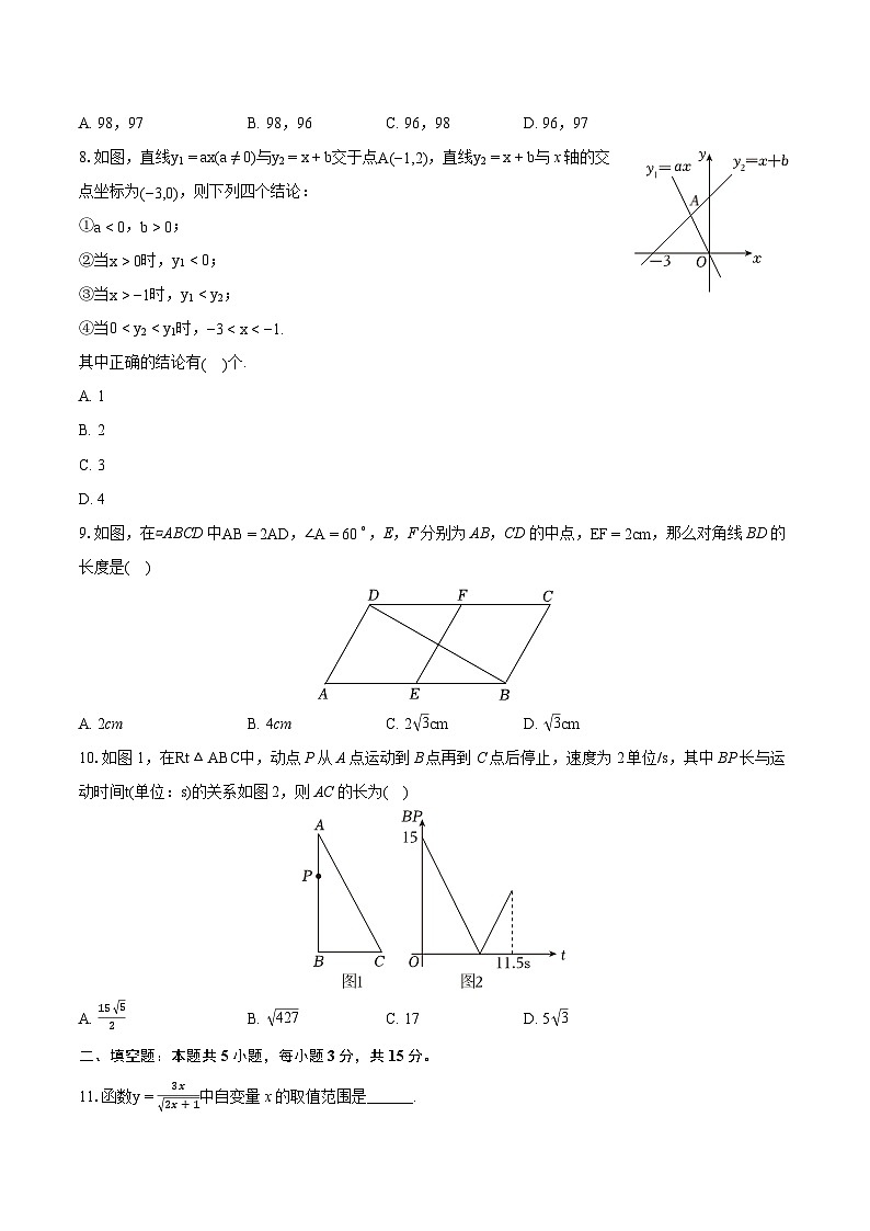 8.如图,直线y1=ax(a≠0)与y2=x+b交于点A(−1,2),直线y2=x+b与x轴的交点坐标为(−3,0),则下列四个结论: