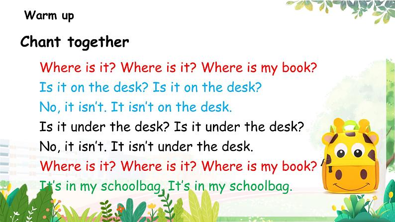 Where is it? Where is it? Where is my bk? Is it n the desk? Is it n the desk?N, it isn’t. It isn’t n the desk. Is it under the desk? Is it under the desk?N, it isn’t. It isn’t under the desk.Where is it? Where is it? Where is my bk?It’s in my schlbag. It’s in my schlbag.