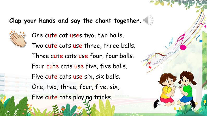 One cute cat uses tw, tw balls.Tw cute cats use three, three balls.Three cute cats use fur, fur balls.Fur cute cats use five, five balls.Five cute cats use six, six balls.One, tw, three, fur, five, six,Five cute cats playing tricks.