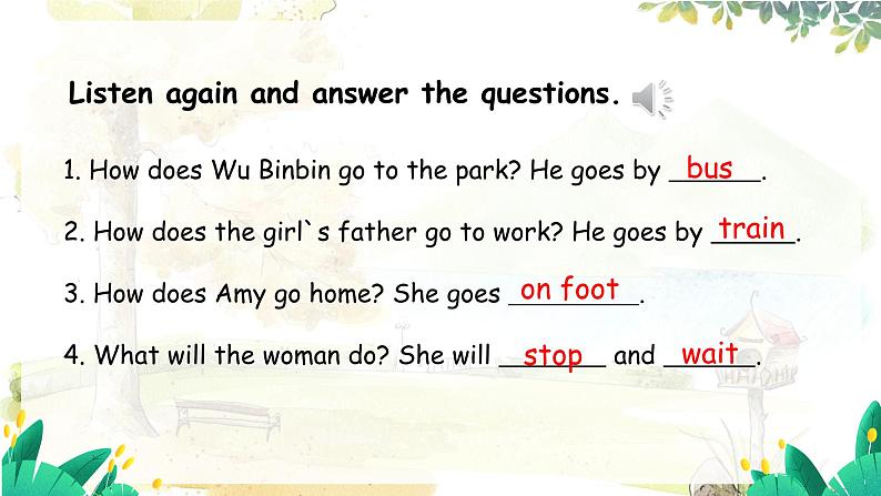 1. Hw des Wu Binbin g t the park? He ges by .2. Hw des the girl`s father g t wrk? He ges by .3. Hw des Amy g hme? She ges .4. What will the wman d? She will and .
