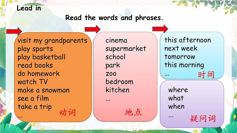1. 学习了词组: lts f, half price, space travel。 2. 询问打算去哪,要说: Where are/is ... ging? 询问打算什么时候去,要说: When are/is ... ging? 询问打算做什么,要说: What are/is ... ging t d?
