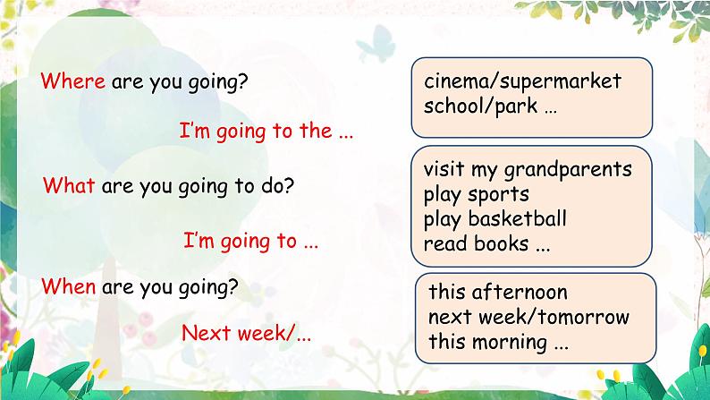 1. —______ is he ging t d? 2. —______ are yu ging? —He’s ging t play ftball. —Tmrrw.3. —______ is Mike ging? 4. —______ is that by? —The U.K. —He’s my cusin.