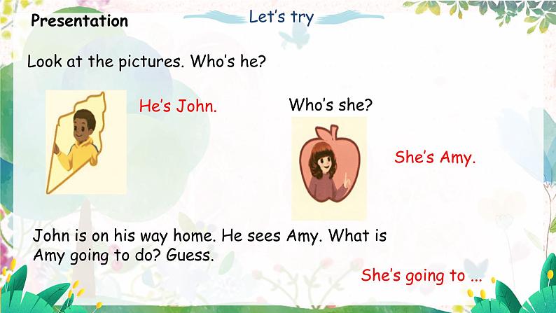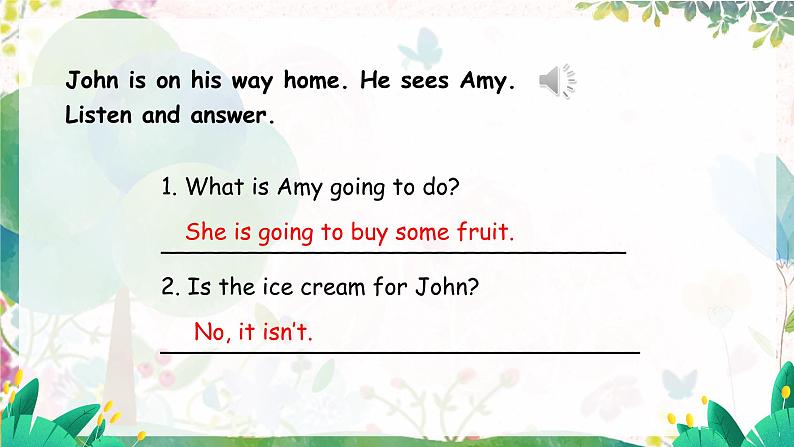 Jhn is n his way hme. He sees Amy. Listen and answer.