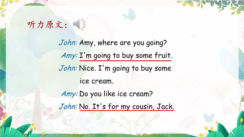 Jhn: Amy, where are yu ging? Amy: I'm ging t buy sme fruit.Jhn: Nice. I'm ging t buy sme ice cream. Amy: D yu like ice cream?Jhn: N. It's fr my cusin, Jack.