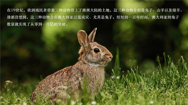 展开在19世纪,欧洲殖民者带着三种动物登上了澳洲大陆的土地,这三种动物分别是兔子、山羊以及绵羊。谁都没想到,这三种动物会在澳大利亚泛滥成灾。尤其是兔子,短短的一百年时间,澳大利亚的兔子数量就实现了从零到一百亿的突破。