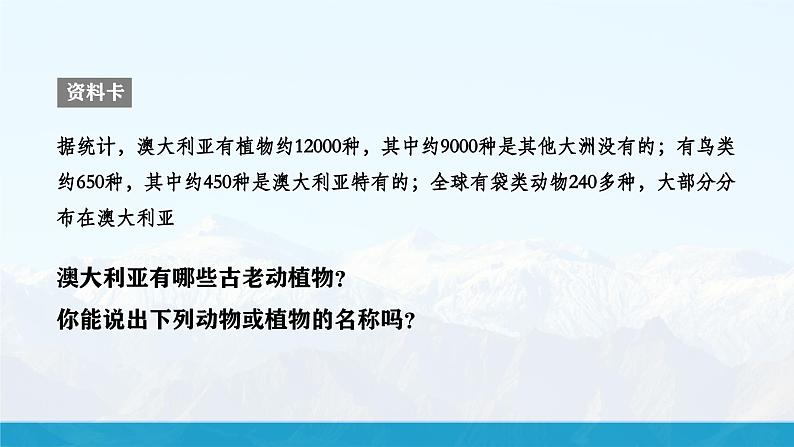 据统计,澳大利亚有植物约12000种,其中约9000种是其他大洲没有的;有鸟类约650种,其中约450种是澳大利亚特有的;全球有袋类动物240多种,大部分分布在澳大利亚