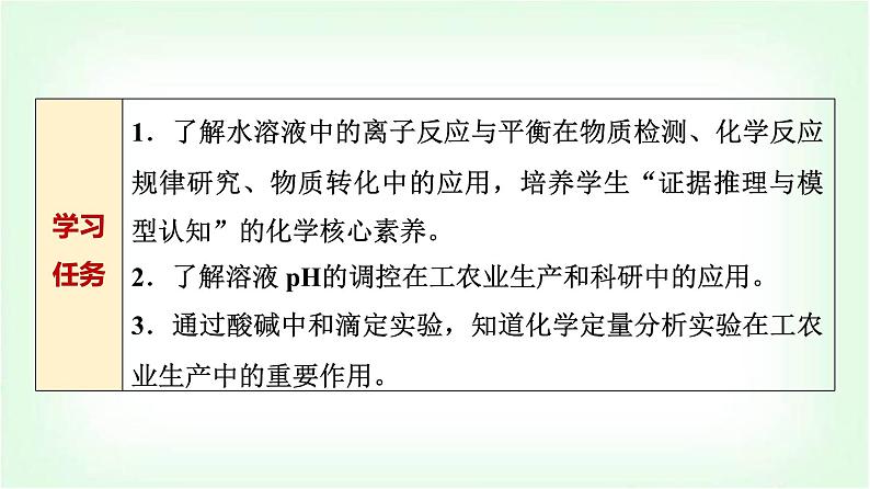 1.了解水溶液中的离子反应与平衡在物质检测、化学反应规律研究、物质转化中的应用,培养学生“证据推理与模型认知”的化学核心素养。2.了解溶液 pH的调控在工农业生产和科研中的应用。3.通过酸碱中和滴定实验,知道化学定量分析实验在工农业生产中的重要作用。