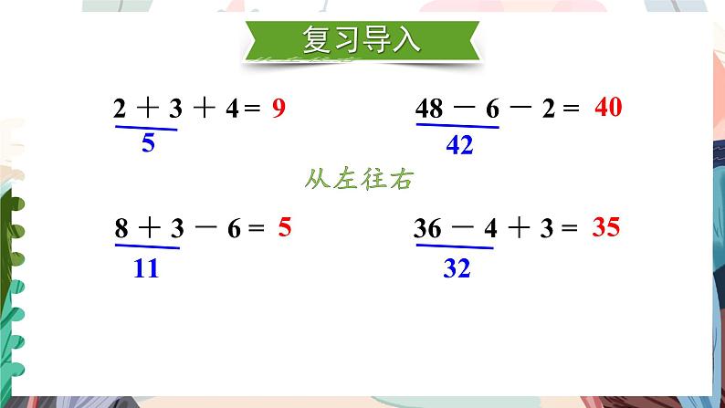 小学数学苏教版二年级上册六 表内乘法和表内除法(二)优质课课件ppt: 这是一份小学数学苏教版二年级上册六 表内乘法和表内除法(二)优质课课件ppt,共15页。PPT课件主要包含了直接写得数,加减混合计算,+6+7=,-7-6=,+7-8=,×3×4,连乘运算,=24,先算2×3=6,运算顺序从左往右等内容,欢迎下载使用。