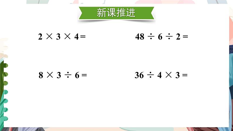 展开苏教版二年级上册六 表内乘法和表内除法(二)授课ppt课件: 这是一份苏教版二年级上册六 表内乘法和表内除法(二)授课ppt课件,共10页。PPT课件主要包含了激趣导入,×7+4,+9×2,×7-5,-3×4,知识讲解,读作2乘3乘4,试一试,练习巩固,算一算等内容,欢迎下载使用。