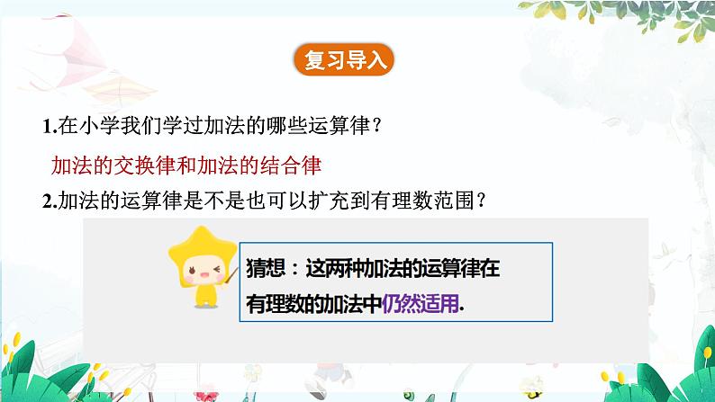 1.在小学我们学过加法的哪些运算律?2.加法的运算律是不是也可以扩充到有理数范围?