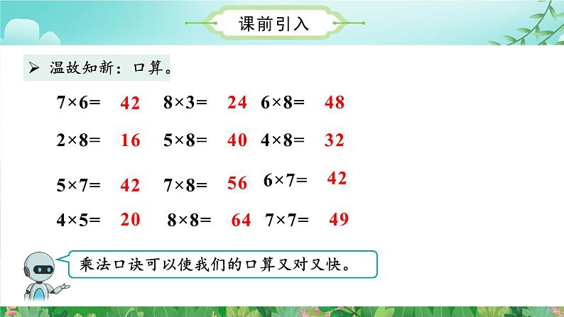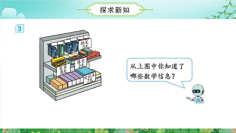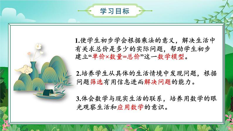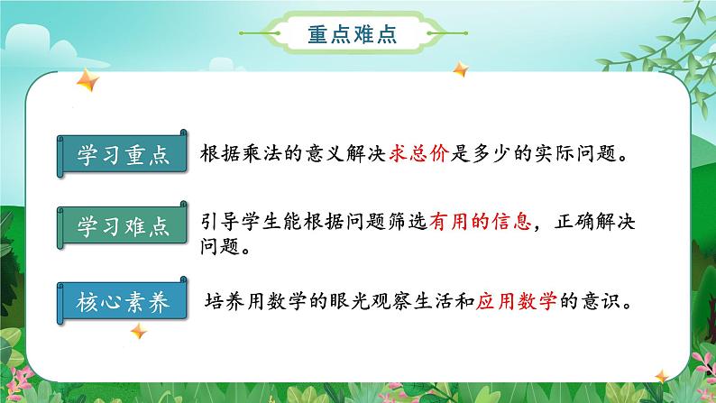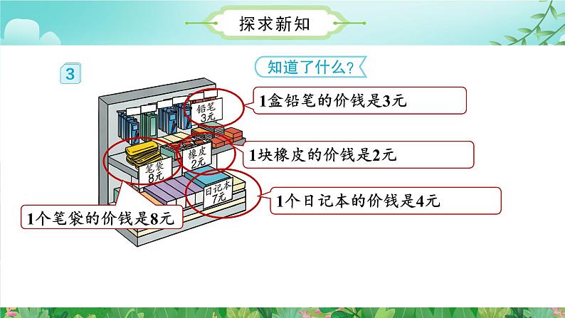 小学数学·二年级(上)·RJ第3课时 解决问题2.培养学生从具体的生活情境中发现问题,根据问题筛选有用信息进而解决问题的能力。1.使学生初步学会根据乘法的意义,解决生活中有关求总价是多少的实际问题,帮助学生初步建立“单价×数量=总价”这一数学模型。3.体会数学与现实生活的联系,培养用数学的眼光观察生活和应用数学的意识。根据乘法的意义解决求总价是多少的实际问题。引导学生能根据问题筛选有用的信息,正确解决问题。培养用数学的眼光观察生活和应用数学的意识。 乘法口诀可以使我们的口算又对又快。温故知新:口算。7×6=428×3=246×8=482×8=165×8=404×8=325×7=427×8=566×7=424×5=208×8=647×7=49学会筛选有用信息,理解问题1个笔袋的价钱是8元1盒铅笔的价钱是3元1块橡皮的价钱是2元1个日记本的价钱是4元买3个笔袋,一共多少钱?买3个笔袋,一共多少钱?根据乘法的意义解决问题买3个笔袋,一共多少钱?一共是3个8元,用乘法计算。8元8元8元8×3=24(元)3×8=24(元)或买3个笔袋,一共多少钱?画算买3个笔袋,一共多少钱?8×3=24(元)?加法:8+8+8=24(元)口答:一共24元。买5个笔袋,一共多少钱?8元8元8元共 ?元8元8元8×5=五八四十40(元)口答:一共40元钱。买6个笔袋,一共多少钱?8×6=六八四十八48(元)口答:一共48元钱。买8个笔袋,一共多少钱?8×8八八六十四口答:一共64元。=64(元)学以致用,求总钱数想一想:买7块橡皮,一共多少钱? 2×7二七十四口答:一共14元。=14(元)或2×7=14(元)3×7=21(元)口答:一共21元。买7盒铅笔,一共多少钱?你还能提出其他用乘法解决的问题并解答吗?买8个日记本,一共多少钱?7×8=56(元) 口答:一共56元。你还能提出其他用乘法解决的问题并解答吗?3×7=21(元)7×8=56(元)通过这些算式,你能发现什么?一个物品的价钱×买的个数=总钱数。8×3=24(元)2×7=14(元)分别指买一个文具的价钱。分别指买的个数。达标练习 巩固成果1教材第79页“练习十九”第1题67424 2(1)42角=4元2角( )角+( )角( )元+( )角 402421元=10角( )元+( )角1教材第79页“练习十九”第1题(2)86484 848角=4元8角 40848( )角+( )角2小小超市。(1)买8个毽子,一共多少钱? 8×8=64(元)答:一共64元。2(2)买5个毽子和3个汉堡共花多少钱?8×5=40(元)口答:一共花49元。3×3=9(元)40+9=49(元)小小超市。2小小超市。(3)买8罐饮料比买3个汉堡多花多少钱?8×7=56(元)口答:多花47元。3×3=9(元)56-9=47(元)2小小超市。(4)你还能提出其他用乘法解决的问题并解答吗?买7个汉堡,一共多少钱?7×6=42(元)答:一共42元。12月份有4个星期多3天,那么12月份一共有多少天?7×4+3=31(天)口答:12月份一共有31天。1个星期有7天,先求4个7是多少。8辆小汽车和1辆货车,一共收费多少元? 8×4=32(天) 32+9=41(天)答:一共收费41元。停车收费标准:小汽车:4元/辆客 车:6元/辆货 车:9元/辆求4张成人票和1张学生票的钱数和。爷爷、奶奶、爸爸、妈妈带小红和弟弟去公园。公园门票的价格如右图。除了弟弟外,其他人都要买门票,一共需要多少钱?成人票:8元/人学生票:4元/人8×4+4=36(元)口答:一共需要36元。1.求几个几是多少,用乘法计算。计算时注意正确使用乘法口诀。2.单个物品的价钱×购买的数量=总价钱。1.完成教材第79练习十九第1-5题; 2.完成《分层作业》。