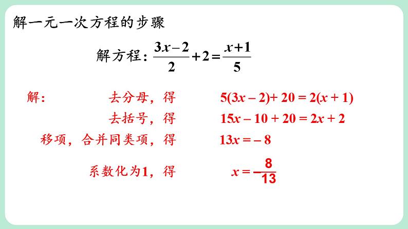 解:去括号,得 3x – 21+5x-20 =15移项,合并同类项,得 8x = 56方程两边都除以8,得 x = 7
