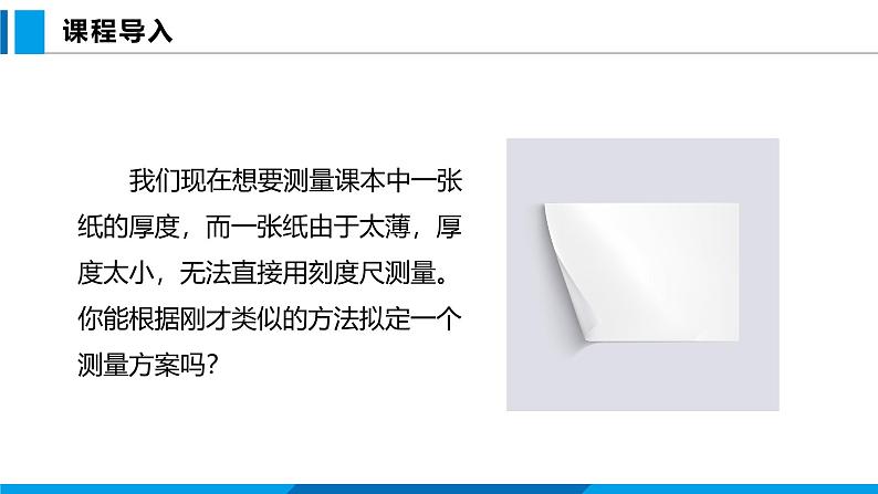 我们现在想要测量课本中一张纸的厚度,而一张纸由于太薄,厚度太小,无法直接用刻度尺测量。你能根据刚才类似的方法拟定一个测量方案吗?