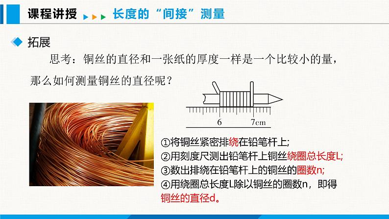 思考:铜丝的直径和一张纸的厚度一样是一个比较小的量,那么如何测量铜丝的直径呢?
