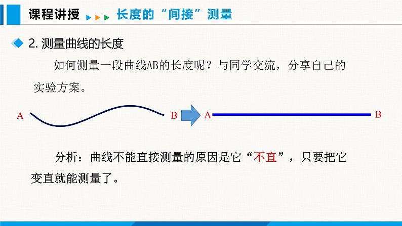 如何测量一段曲线AB的长度呢?与同学交流,分享自己的实验方案。